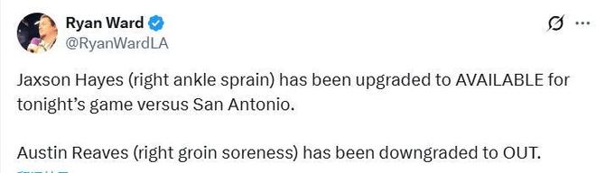 里夫斯與東契奇均缺席了上一場(chǎng)對(duì)陣開(kāi)拓者隊(duì)的比賽,盡管缺少兩位頭號(hào)得分手,湖人隊(duì)仍取得了一場(chǎng)令人印象深刻的勝利。不過(guò)東契奇并未出現(xiàn)在今日的傷病報(bào)告中,確認(rèn)可以出戰(zhàn),而里夫斯將至少再缺席一場(chǎng)。
